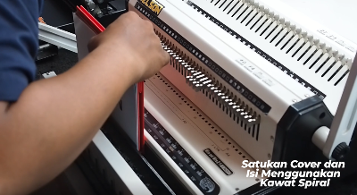 Selanjutnya kaki kalender dan isi kalendernya tersebut dilubangi. Untuk kaki kalendernya dilubangi pada kedua sisi atas dan bawahnya dengan menggunakan Mesin Jilid Spiral Kawat Telson. Sehingga lubang spiral yang dibuat tersebut akan bertemu saat kaki kalender didirikan.