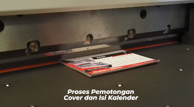 Setelah tercetak, barulah laminasi kertas isi dan cover kaki kalender agar terhindar dari kerusakan. Setelah terlaminasi, baru kita lakukan proses pemotongan agar terlihat lebih rapi dan menarik.