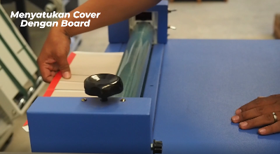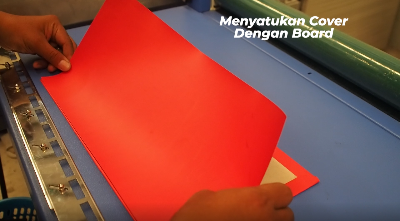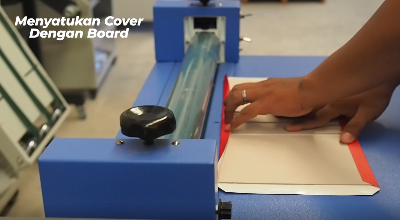 Caranya letakkan cover di atas meja dengan bagian muka menghadap ke bawah, tempelkan board pada bagian atasnya, disini kita menggunakan Mesin Hardcover Press and Fold.